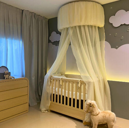 Un espacio pensado para soñar tranquilo... Diseñamos cada detalle para crear una atmósfera cálida, suave y funcional. Un dosel de tela envuelve la cuna y oculta el aire acondicionado, un panel con luz difusa ilumina sin molestar al bebé, y las nubes corpóreas acompañan el ambiente con un toque mágico. Diseño, confort y ternura en perfecta armonía.